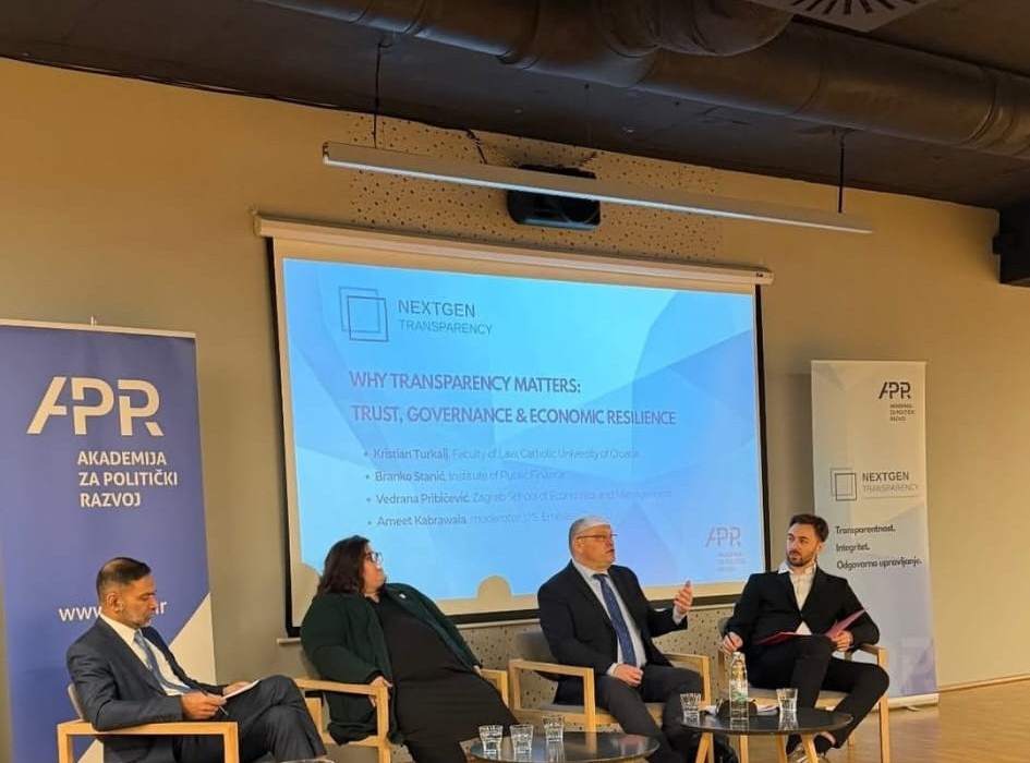 Branko Stanić, researcher at the Institute of Public Finance, participated in a panel discussion as part of the first seminar within the educational program NextGen Transparency 2.0 organized by the Academy for Political Development (APD) in Zagreb from 20 to 22 February 2026, with the support of the U.S. Embassy in Croatia.
