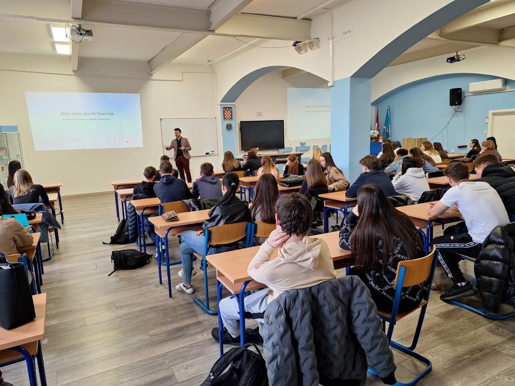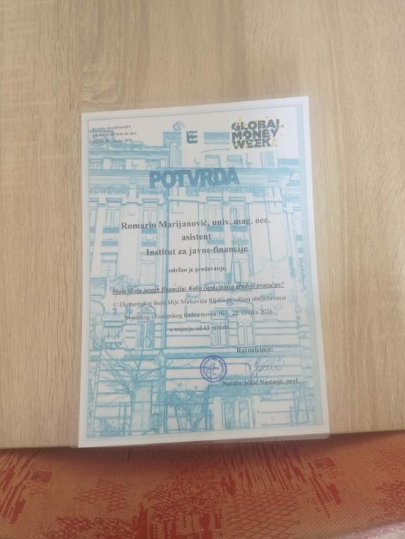 Assistant Romario Marijanović held on 20 March 2026 an educational lecture on public finance on the example of the City of Rijeka budget to students of the Mijo Mirković School of Economics in Rijeka, as part of the European and Global Money Week.