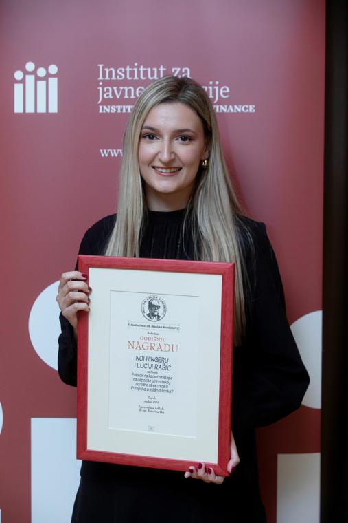 U studentskoj kategoriji, 2.000 eura i diplome dobili su Noa Hinger i Lucija Rašić s Ekonomskog fakulteta Sveučilišta u Zagrebu za rad „Pritisak na kamatne stope na depozite u Hrvatskoj: narodne obveznice ili Europska središnja banka?“.
