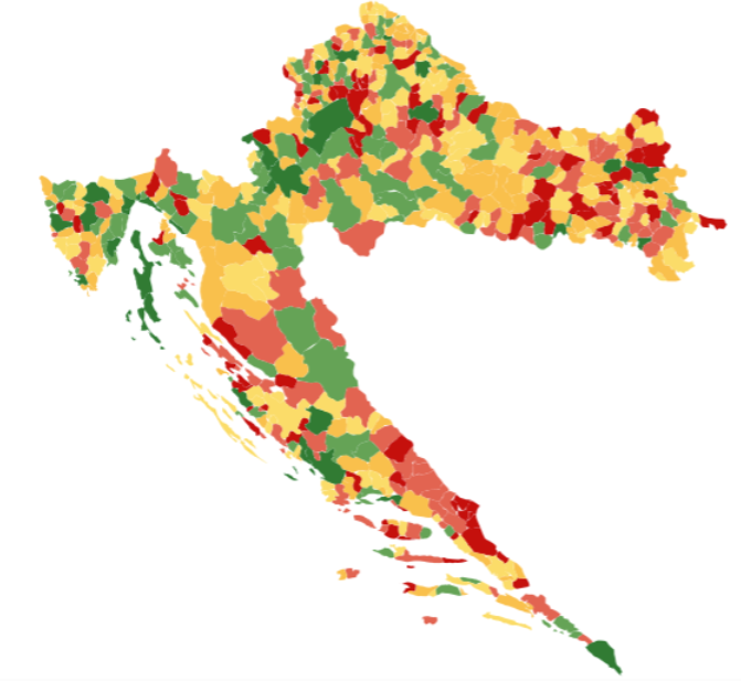 Karta prikazuje proračunsku transparentnost mjerenu brojem ključnih proračunskih dokumenata objavljenih na mrežnim stranicama svih županija, gradova i općina. To su: